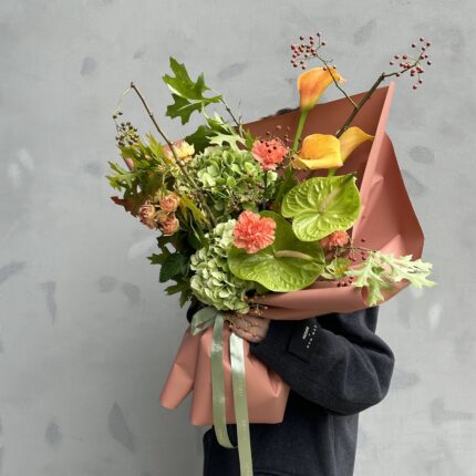 Осенний букет в оранжево-зеленых оттенках. В составе: гортензия, антуриум, калла, шиповник и кустовая роза. Букет перевязан декоративными лентами и упакован