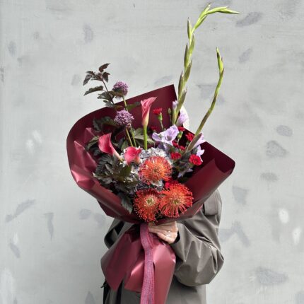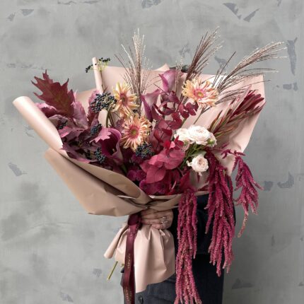 Осенний букет в красных оттенках. В составе: гортензия, калла, леукоспермум, гладиолус, гвоздика Шабо и листья дуба. Букет перевязан декоративными лентами