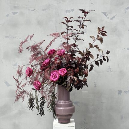 Композиция в корзине в темно-бордовой цветовой гамме. В составе: хризантема, калла, роза кустовая, эустома и прунус. С композицией вы получите