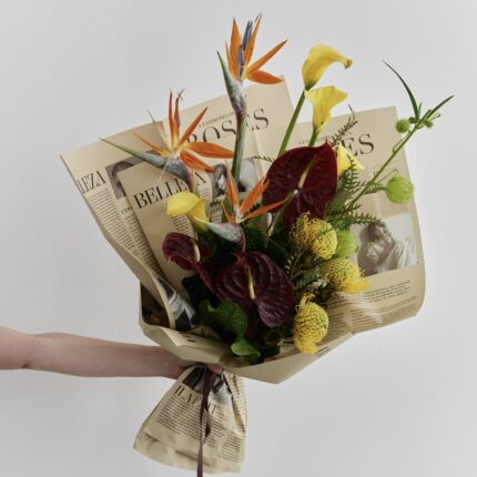 Осенний букет в оранжево-бордовых оттенках. В составе: стрелиция, антуриум, калла, леукоспермум. Букет перевязан декоративными лентами и упакован в матовую бумагу