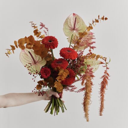 Яркий букет в красных оттенках. В составе: антуриум, гербера, амарант и стабилизированный эвкалипт. Букет перевязан декоративными лентами. С букетом вы
