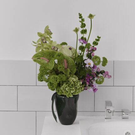 Букет в зелено-розовых оттенках. В составе: антуриум, гортензия, цимбидиум, орнитогалум, вибурнум и малюцелла. Букет перевязан декоративными лентами. С букетом вы