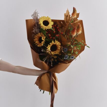 Осенний букет в оранжевых оттенках. В составе: хризантема Виена, роза кустовая, банксия, физалис, шиповник, листья дуба и стабилизированный эвкалипт. Букет
