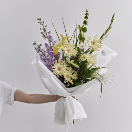 Нежный букет в бело-фиолетовой гамме. В составе: гербера паста, калла, дельфиниум, гладиолус и малюцелла. Букет перевязан декоративными лентами и упакован