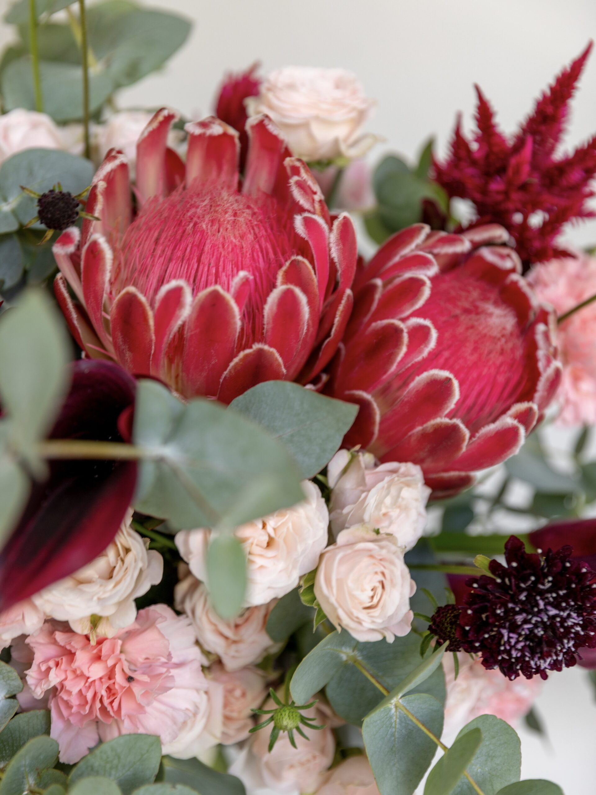 Яркий стильный букет в бордово-розовой цветовой гамме. В составе: протея, кустовые розы, эвкалипт и диантус. Станет эффектным украшением любого пространства, также является итересным решением для подарка.