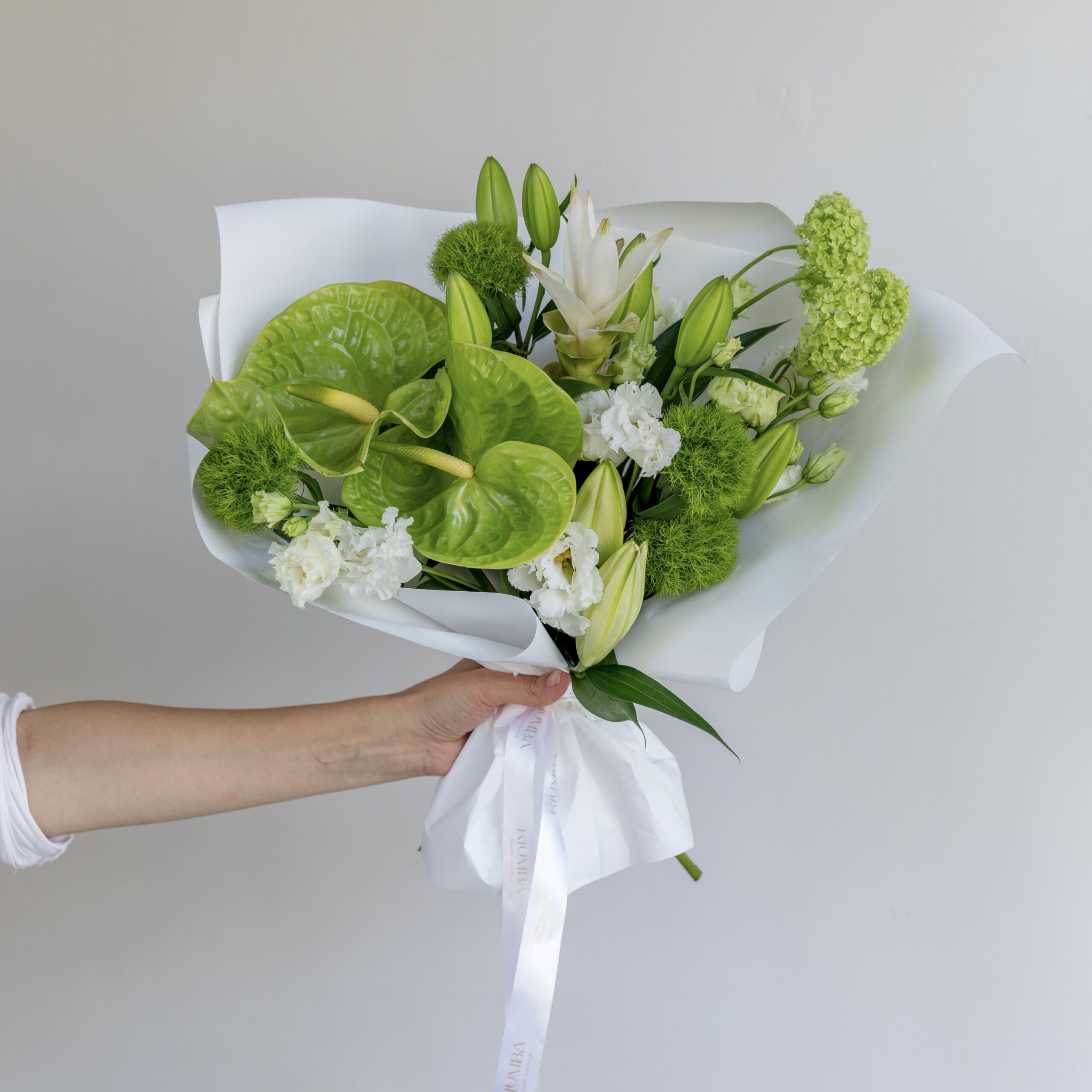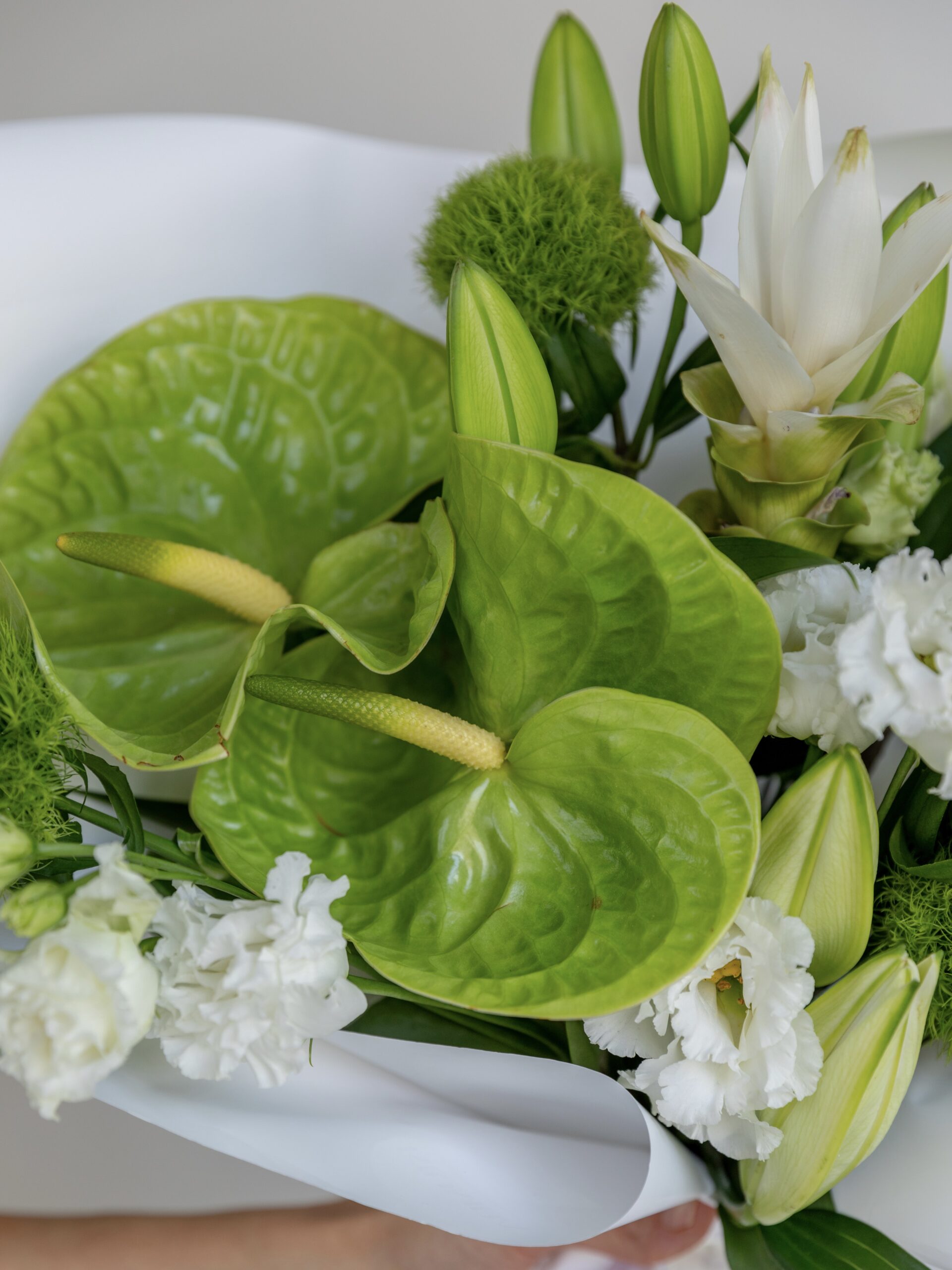 Нежный букет в белой-зеленой цветовой гамме. В составе: антуриум, лилии, эустома и диантус. Букет перевязан декоративными лентами.