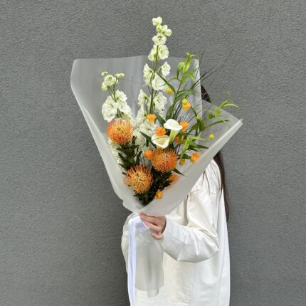 Букет в бело-оранжевой цветовой гамме. В составе: леукоспермум, калла, сандерсония, дельфиниум и берграс. Букет перевязан декоративными лентами и упакован в