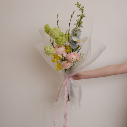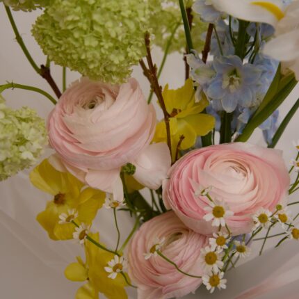 Этот букет — словно иллюстрация к романтической сказке. Нежные ранункулюсы, похожие на миниатюрные пионы, соседствуют с редкими ранункулюсами батерфляй —