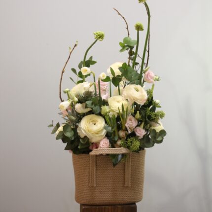 Весенняя композиция в корзине в светлой цветовой гамме. В составе: ранункулюс, эустома и декоративные ветки. С композицией вы получите конверт