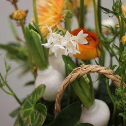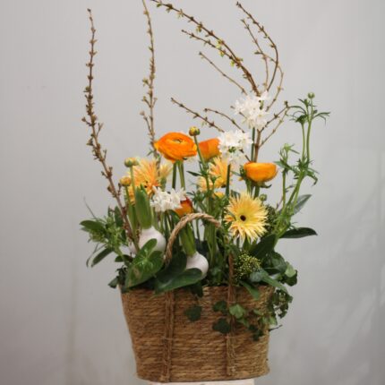 Яркая весенняя композиция в корзине в желто-оранжево-зеленой гамме. В составе: ранункулюс, гербера, нарцисс и луковицы гиацинта. С композицией вы получите