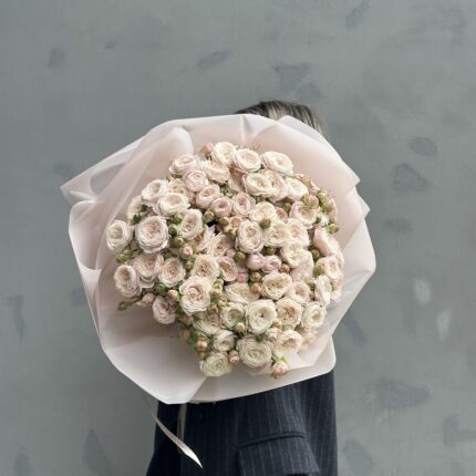 Монобукет из 21 веток пионовидной розы в упаковке.