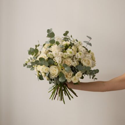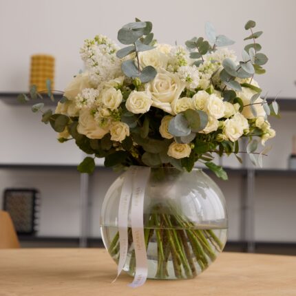 Этот букет словно переносит нас в майский сад, где цветут розы и благоухает сирень. Крупные розы выглядят роскошно и солидно,