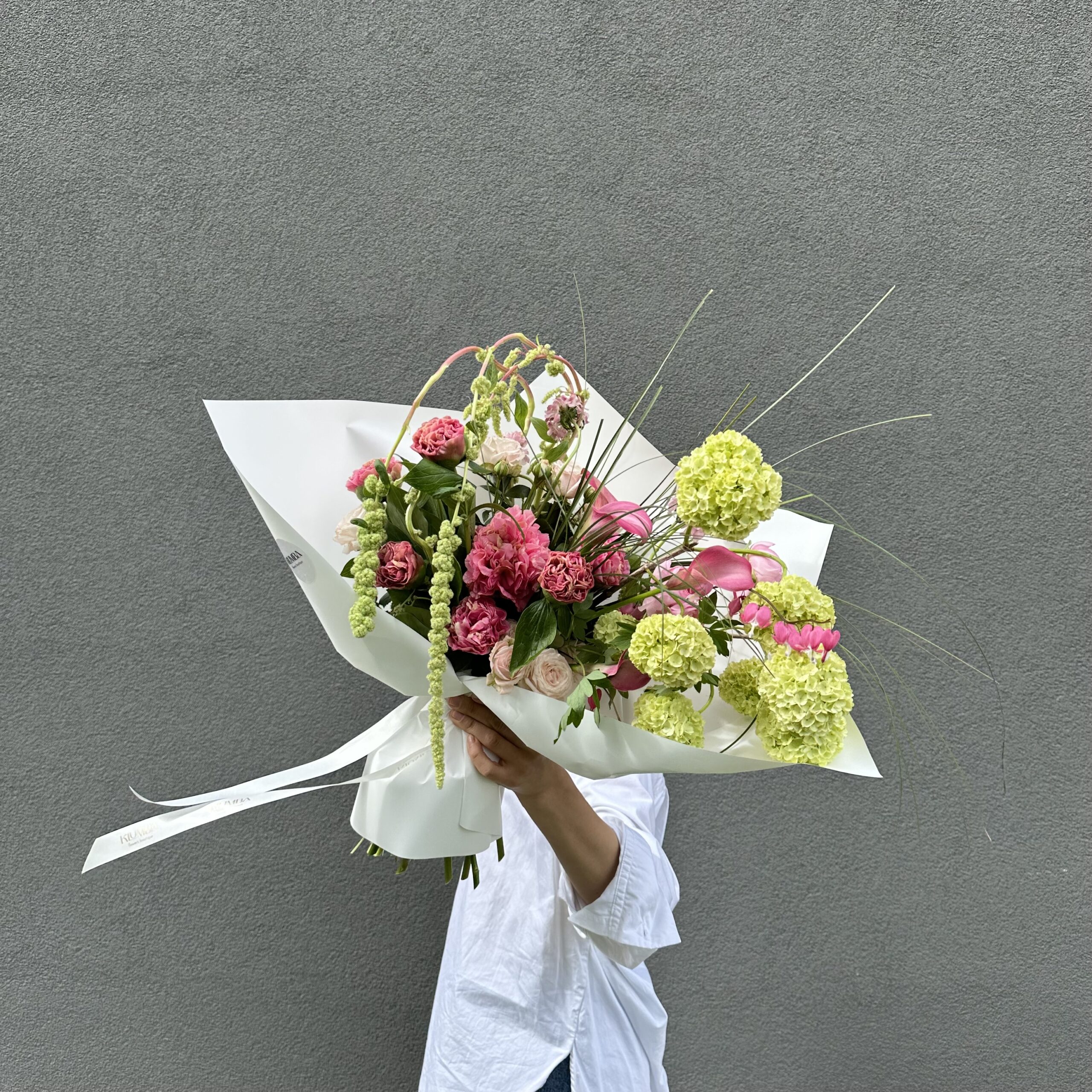 Яркий букет в зелено-розовой цветовой гамме. В составе: пионы, калы, розы кустовые, вибурнум и амарант. Букет перевязан декоративными лентами и упакован в матовую бумагу.