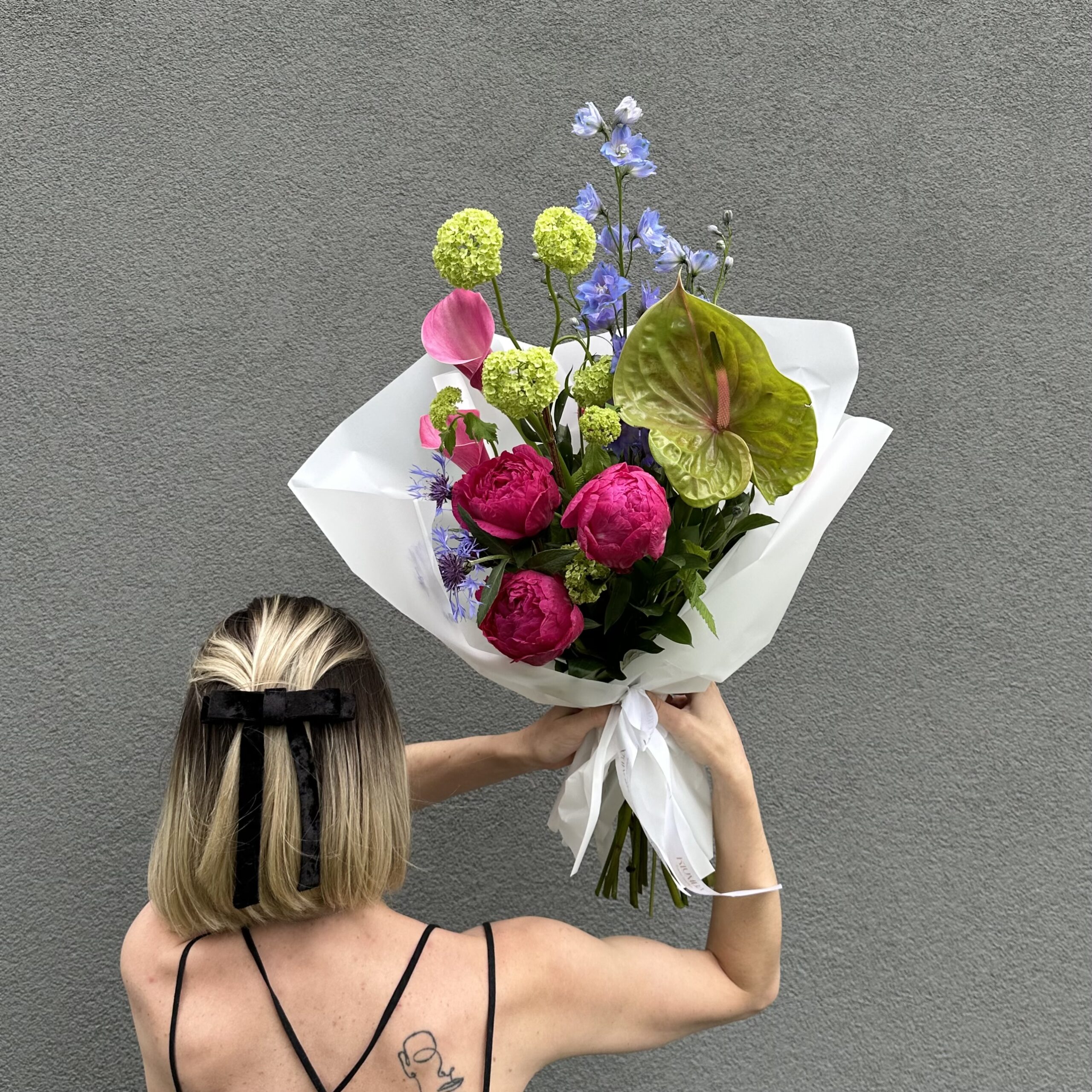 Яркий букет в розово-бордовой цветовой гамме. В составе: пионы, каллы, антуриум, дельфиниум и вибурнум. Букет перевязан декоративными лентами и упакован в матовую бумагу.