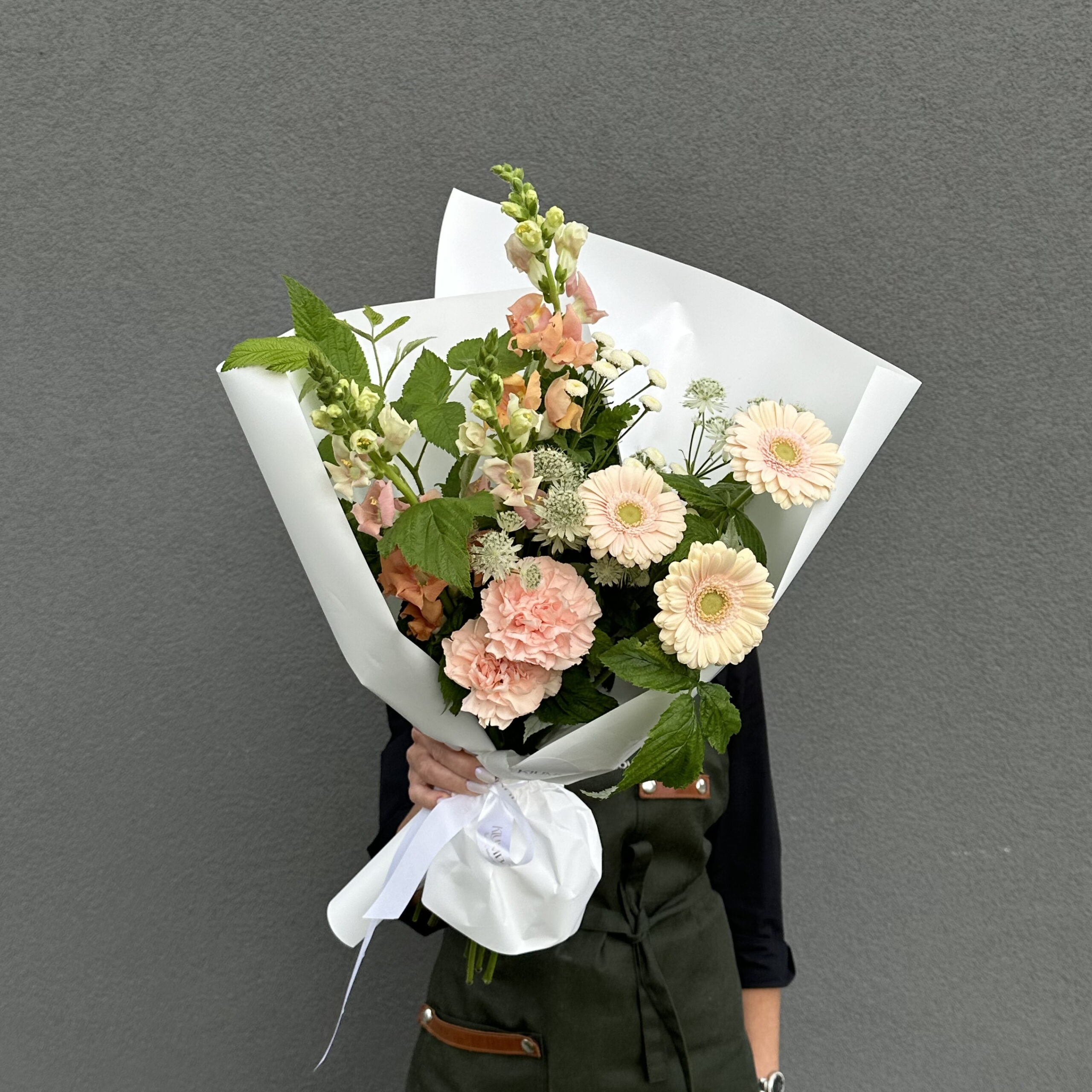 Нежный летний букет в персиковой цветовой гамме. В составе: герберы, диантус, абстракция, антиринум. Букет в упаковке и перевязан декоративными лентами.