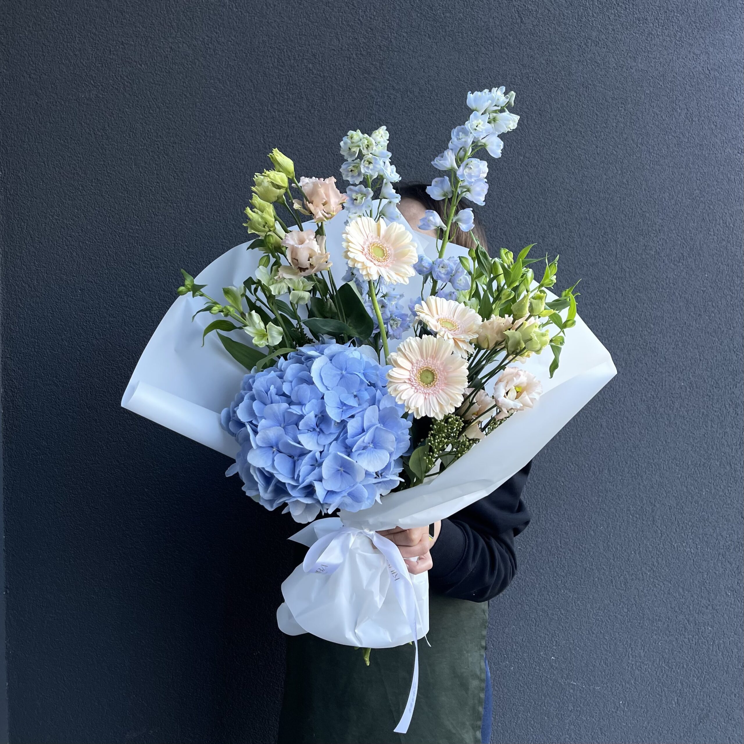 Букет в бежево-голубой цветовой гамме. В составе гортензия, гербера, эустоама, альстромерия и дельфиниум.
