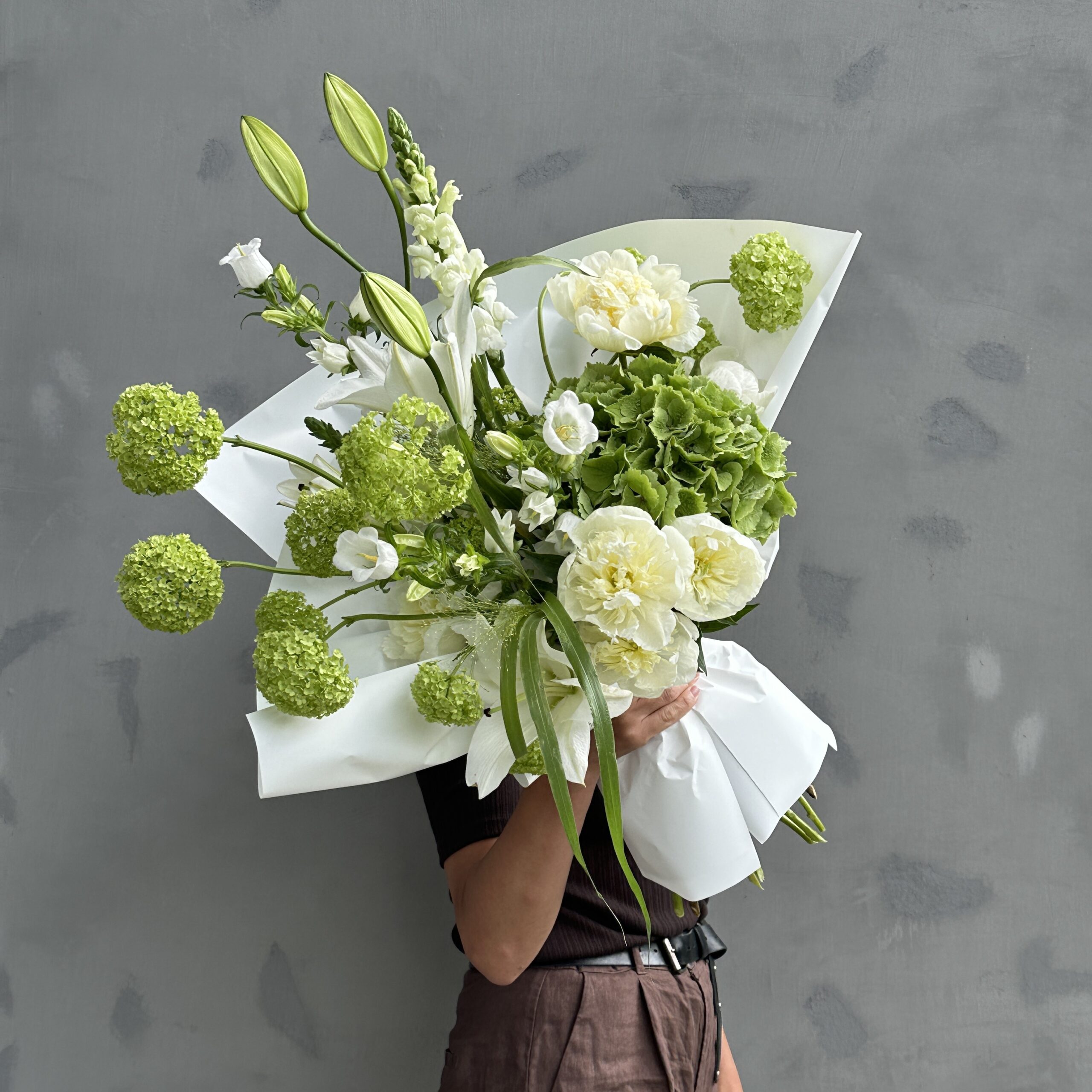 Летний букет в зелено-белой цветовой гамме. В составе: пионы, лилия, гортензия и вибурнум. Букет перевязан декоративными лентами и упакован в матовую бумагу.