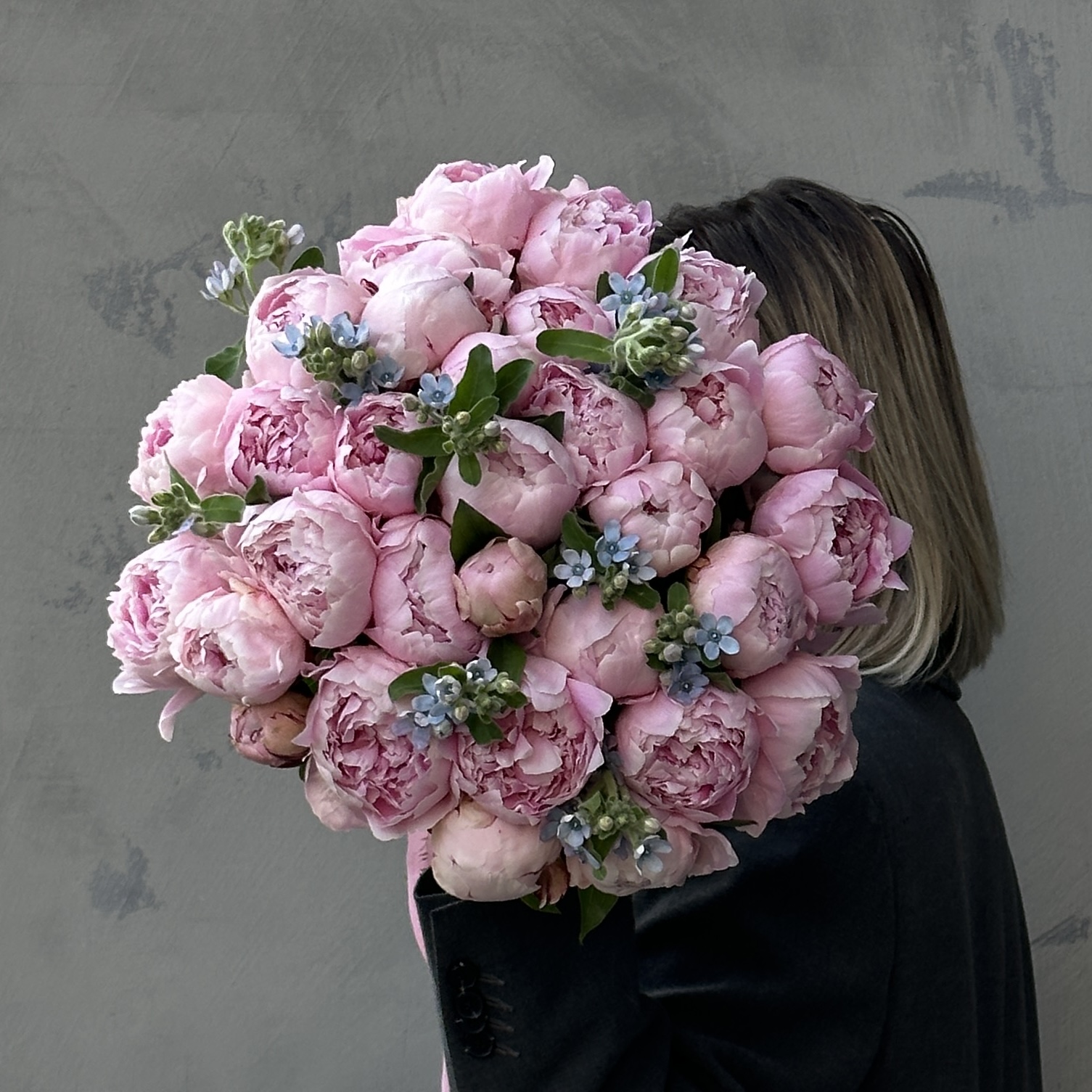 Букет из 45 пионов сорта Сара Бернар и оксипеталума. Отличаются пышными махровыми бутонами нежной жемчужно-розовой окраски. Обладает очень ярким сочным ароматом. Упакованы в плотную бумагу белого цвета и перевязаны декоративными лентами.