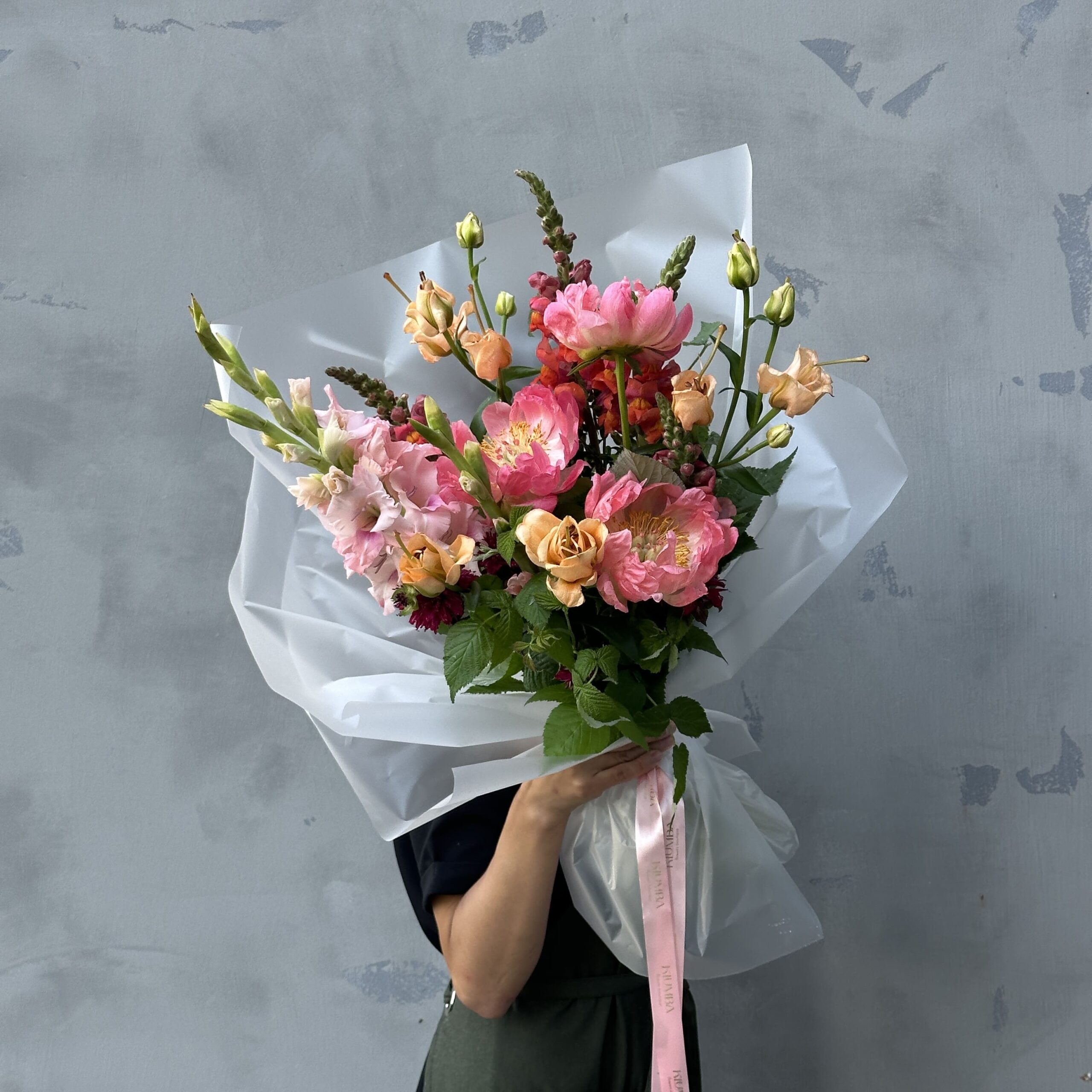 Летний букет в розовой цветовой гамме. В составе: пионы, гладиолус, лилия, антириниум и ветки малины. Букет перевязан декоративными лентами и упакован в матовую бумагу.