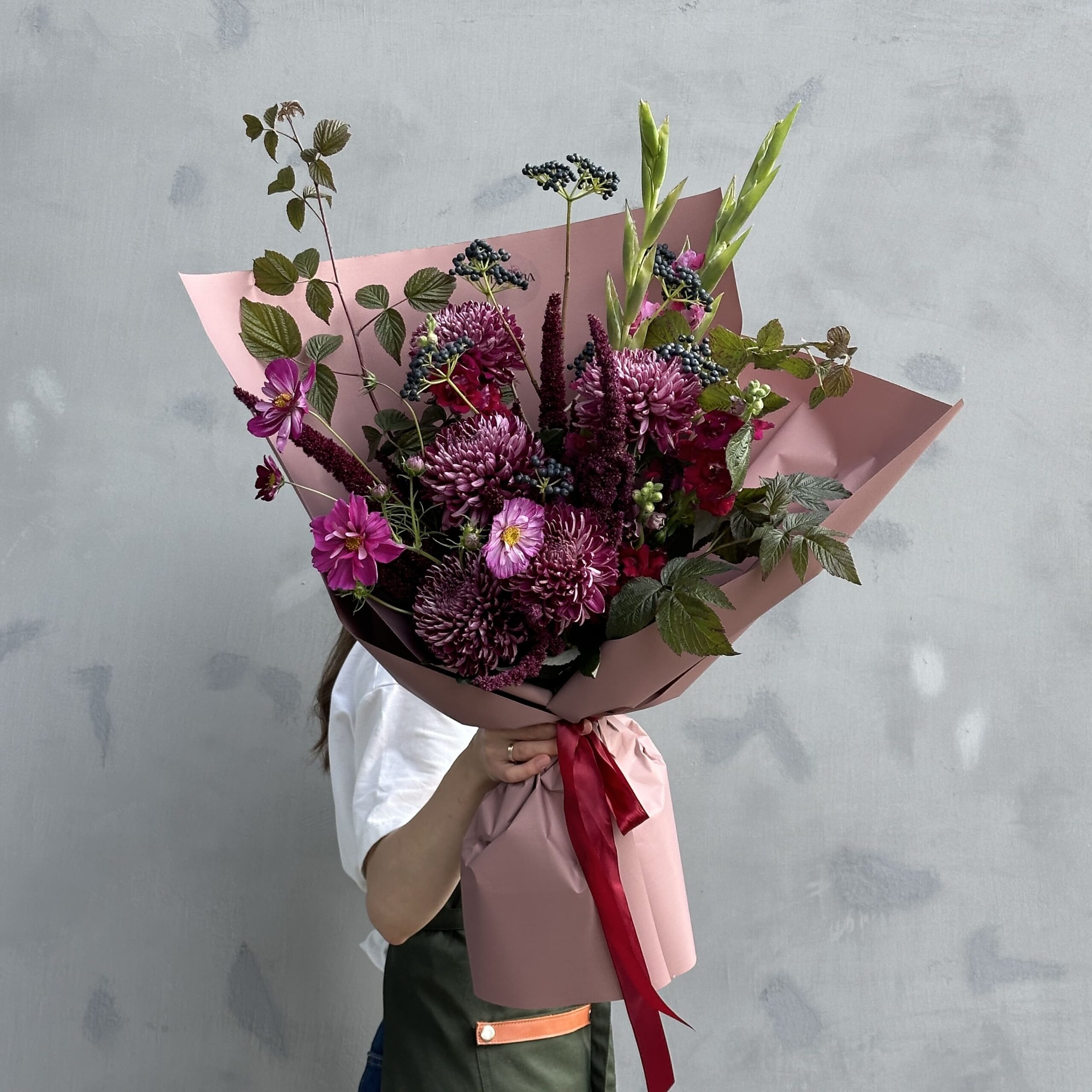 Осенний букет в красных оттенках. В составе: хризантема, гладиолус, вибурнум и листья дуба. Букет перевязан декоративными лентами и упакован в матовую бумагу.