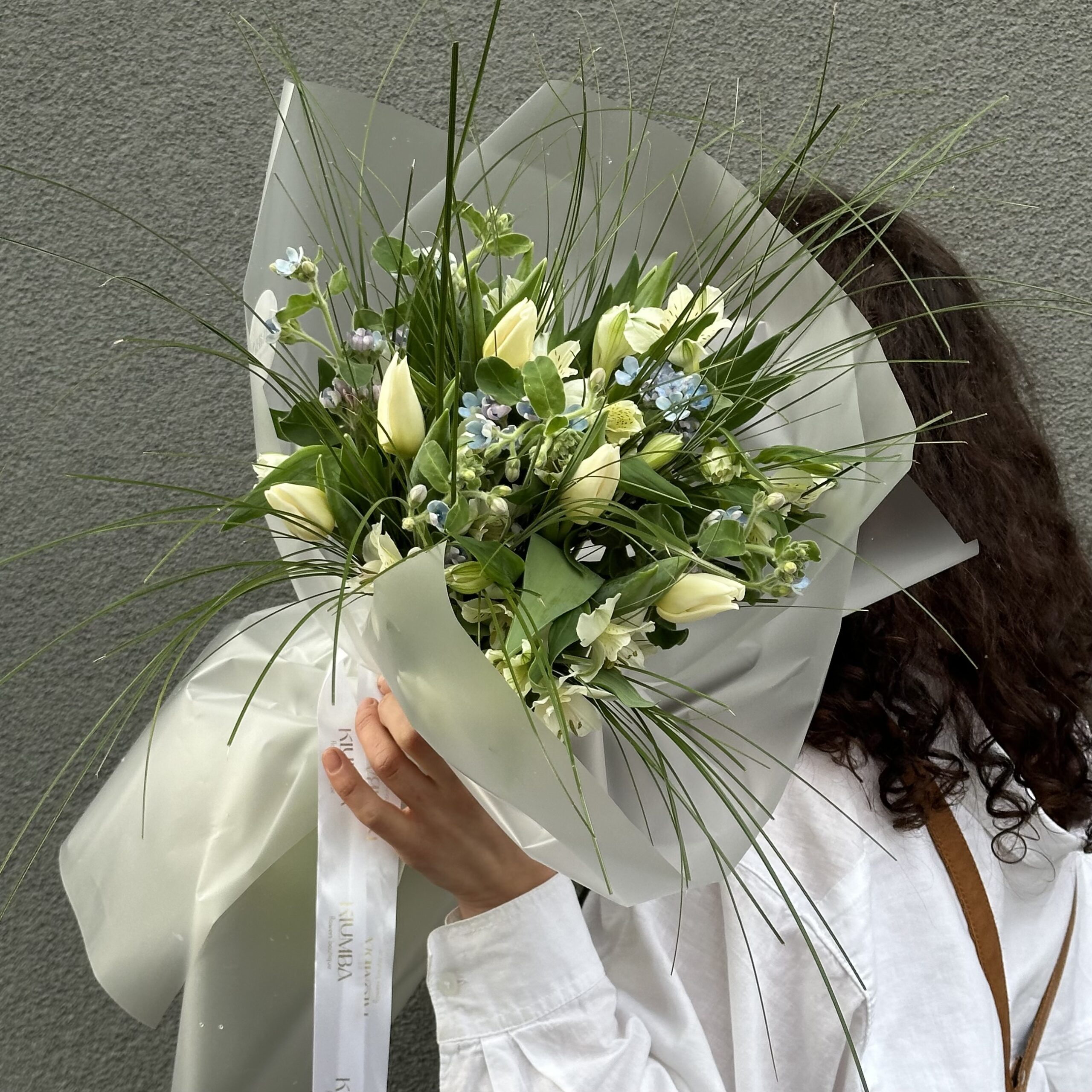 Нежный весенний букет в бело-зеленой цветовой гамме. В составе тюльпан, альстромерия, оксипеталум и берграсс. Букет упакован в прозрачную матовую бумагу.