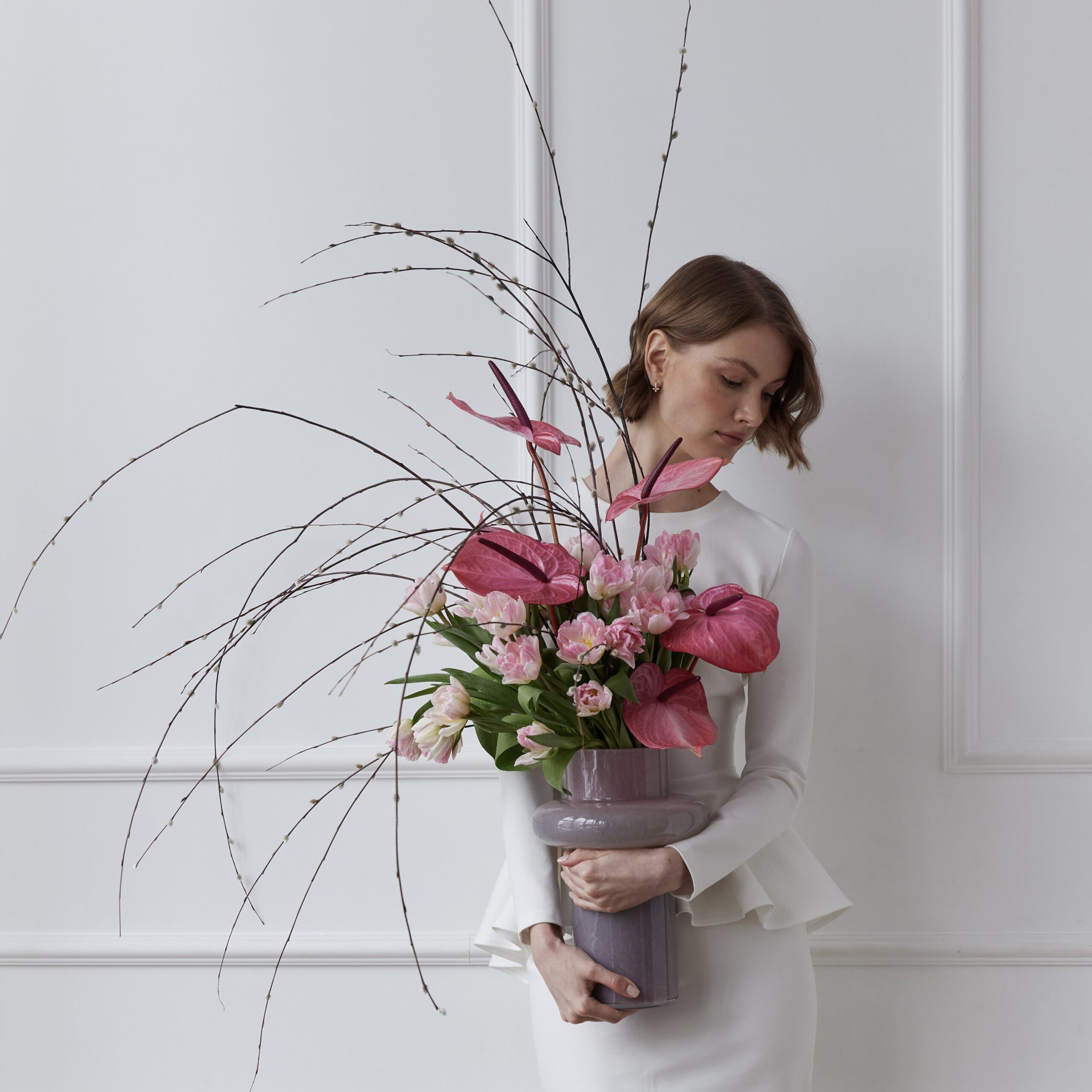 Весенний букет в розовой гамме. В составе: антуриум, тюльпаны и декоративные ветки. Букет перевязан декоративными лентами. Стоимость указана без учета вазы.