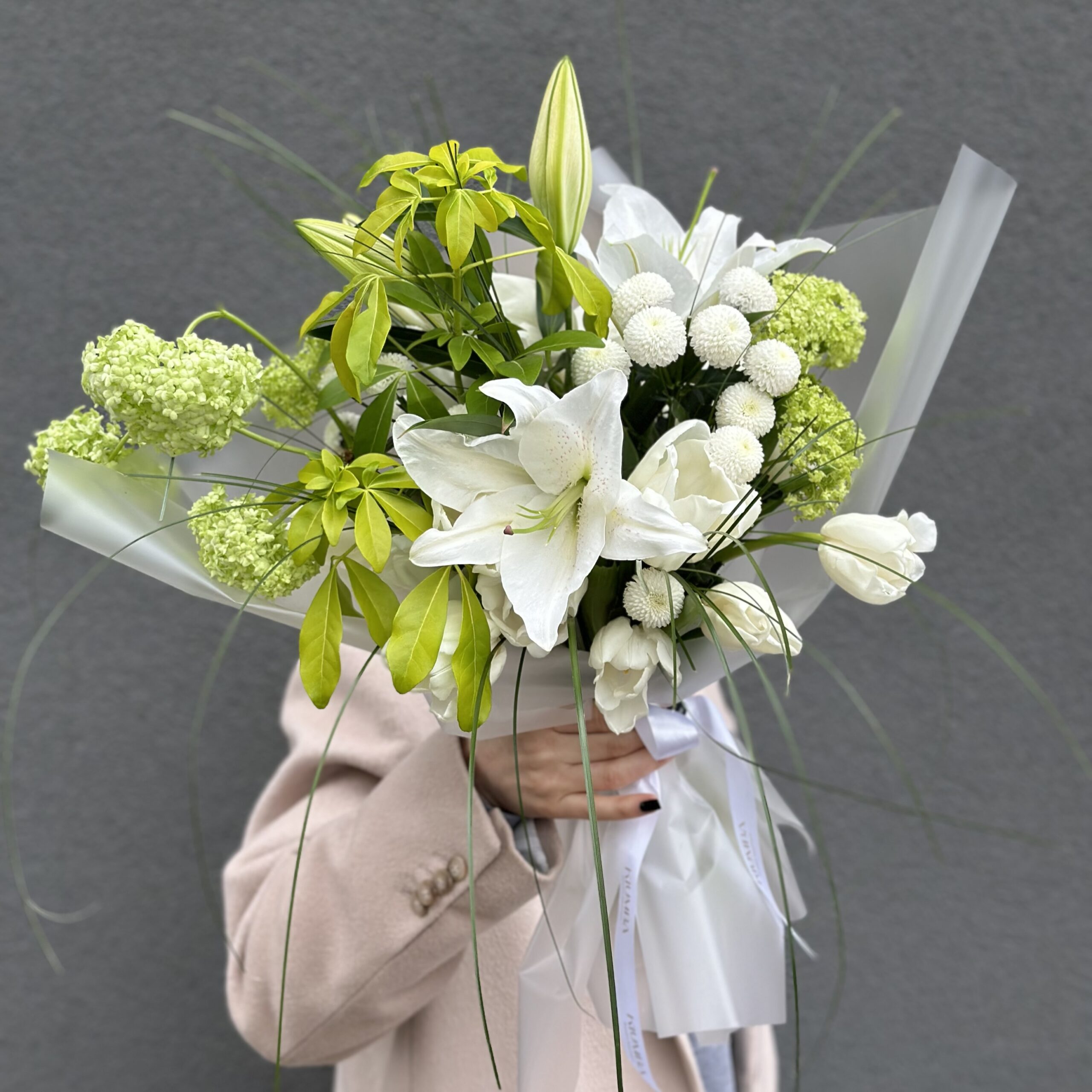Нежный весенний букет в бело-зеленой цветовой гамме. В составе тюльпан, лилия, вибурнум, кустовая хризантема и берграсс. Букет упакован в прозрачную матовую бумагу.