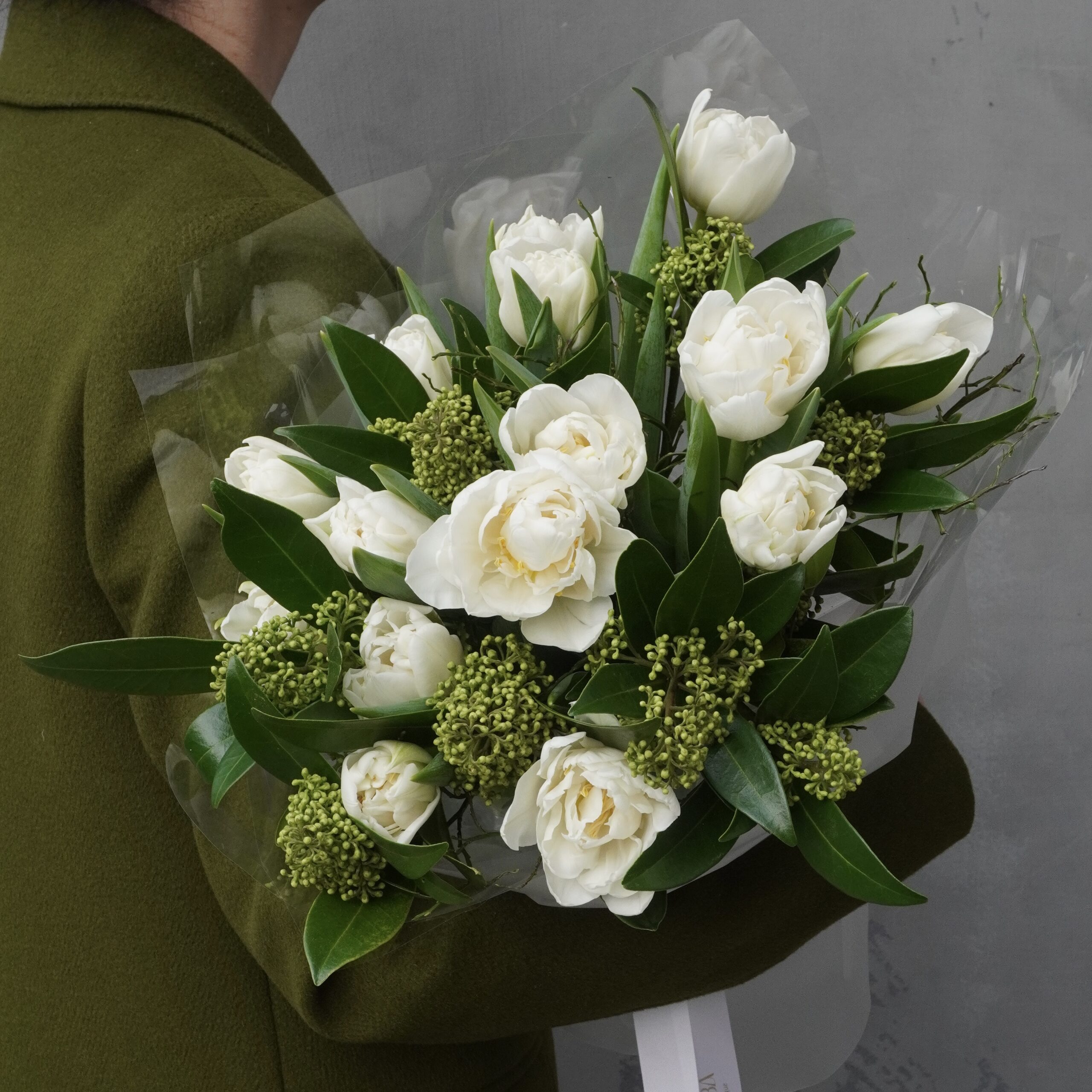 Букет в бело-зеленой цветовой гамме. В составе: тюльпан и скимия. Букет упакован в прозрачную бумагу и перевязан декоративными лентами.