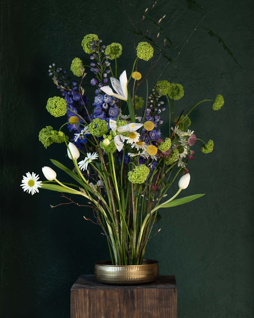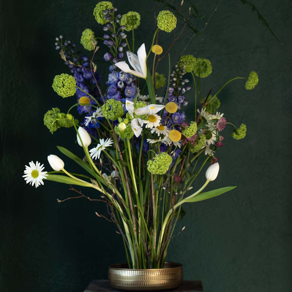 Композиция из дельфиниумов, вибирнума и тюльпанов