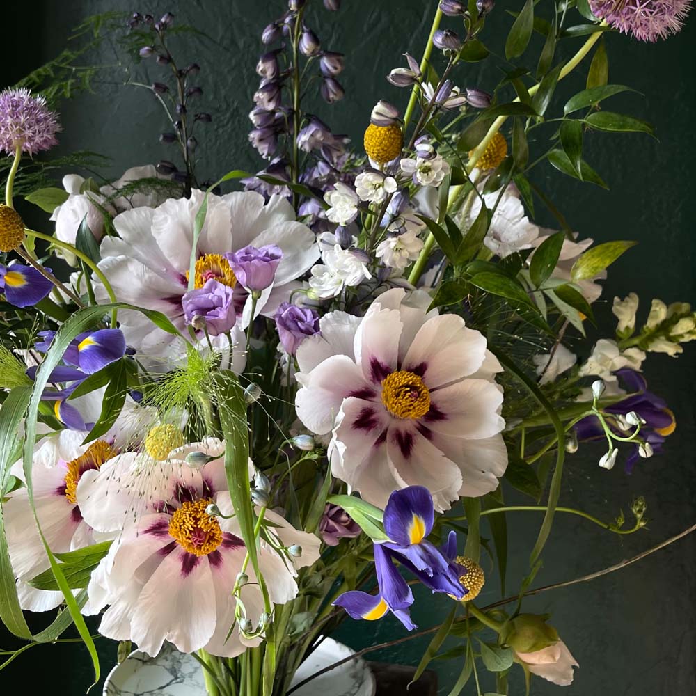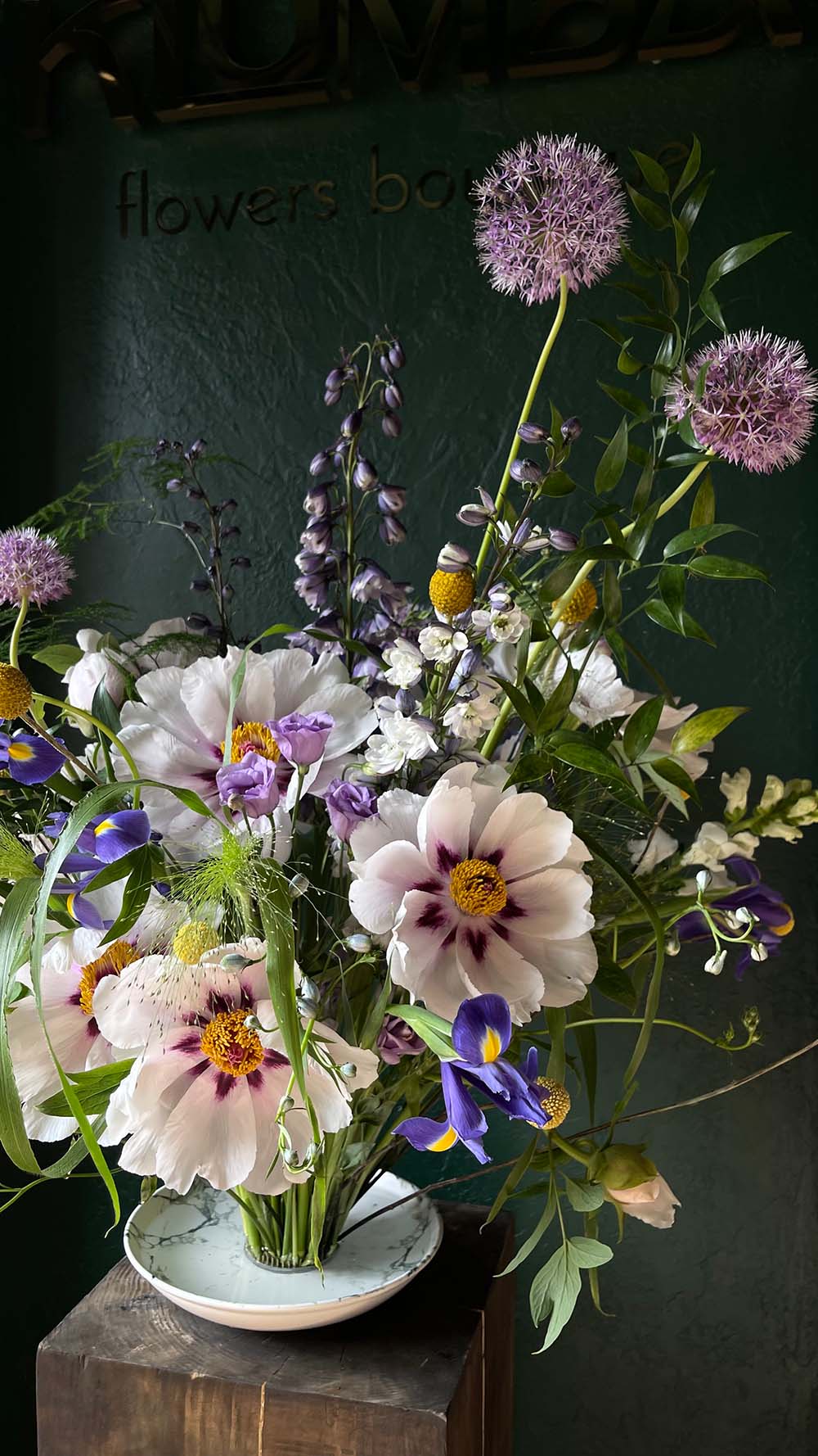 Композиция из пионов, подиумов, ирисов, дельфиниумов и зелени