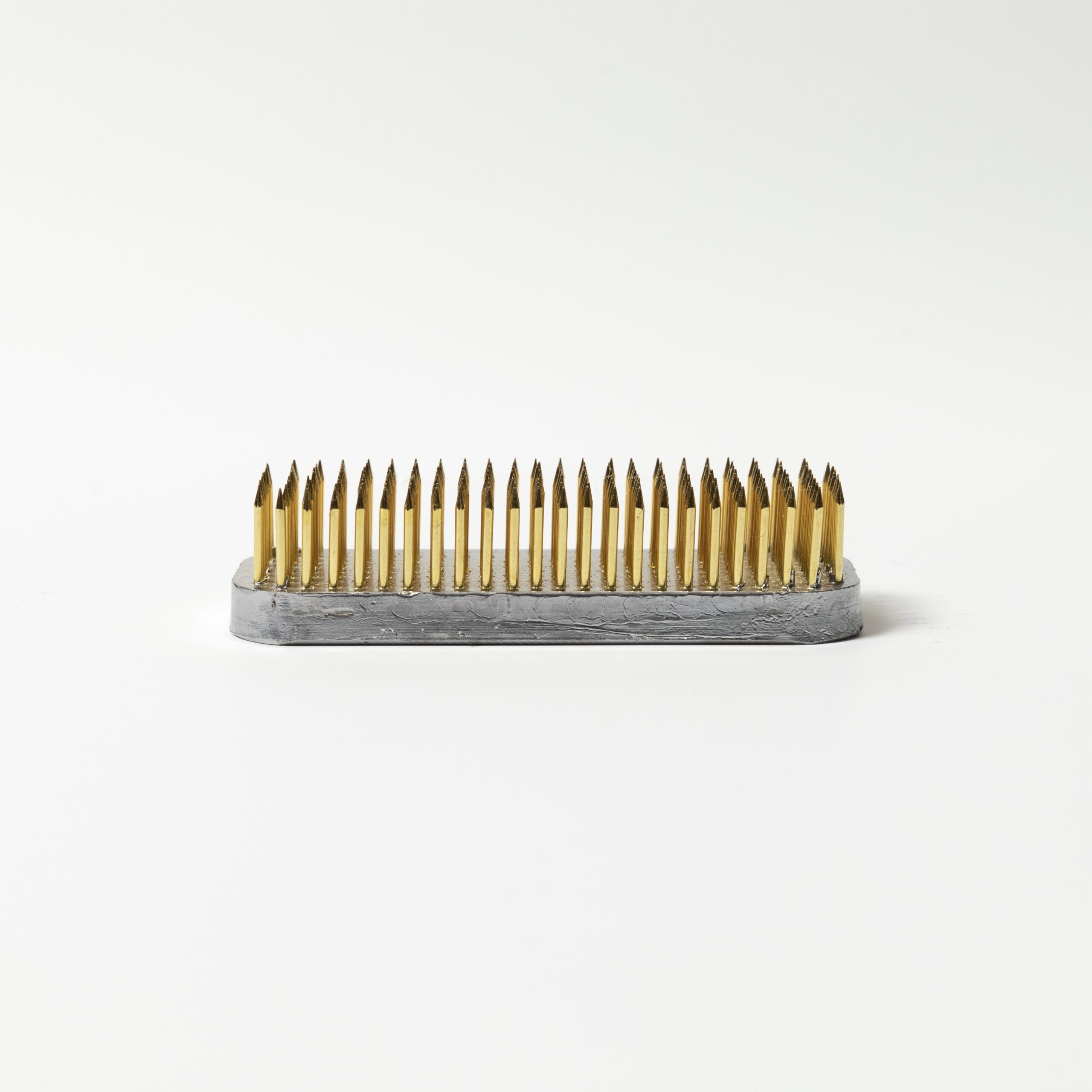 Размер 115*33 мм, игла 13 мм, высота основания 7 мм, вес295 грамм. Кензан «полоска» большой №1 115*33 мм — Удлиненный кензан, предназначен для невысоких плоских ваз, а также, для узких длинных ваз. Подходит для миниммалистичных композиций с использованием веток и стеблей с изящными изгибами. Рассчитан на 1-20 стеблей. Кензан предназначен для создания цветочных композиций. Данный кензан можно использовать для средних композиций. Создайте цветочную композицию путем накалывания стеблей на латунные иглы кензана или расположения стеблей между иглами. Тяжёлая основа из свинца за счёт веса делает кензан устойчивым, что позволяет не использовать дополнительные крепления, кроме сбалансированной композиции.