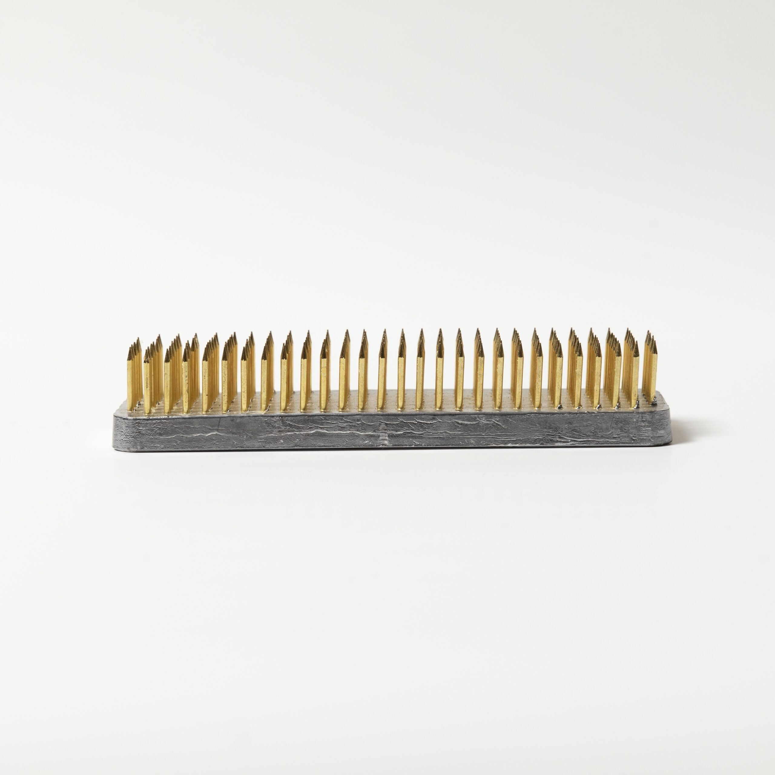 Кензан японский металлический, размер 120*43 мм, игла 16 мм, высота основания 6 мм, вес с коробкой 440 грамм. Кензан «полоска» большой №2 120*43 мм — Удлиненный кензан, предназначен для невысоких плоских ваз, а так же для узких длинных ваз. Подходит для миниммалистичных композиций с использованием веток и стеблей с изящными изгибами. Рассчитан на 1-25 стеблей. Кензан предназначен для создания цветочных композиций. Данный кензан можно использовать для больших раскидистых композиций. Создайте цветочную композицию путем накалывания стеблей на латунные иглы кензана или расположения стеблей между иглами. Тяжёлая основа из свинца за счёт веса делает кензан устойчивым, что позволяет не использовать дополнительные крепления, кроме сбалансированной композиции.