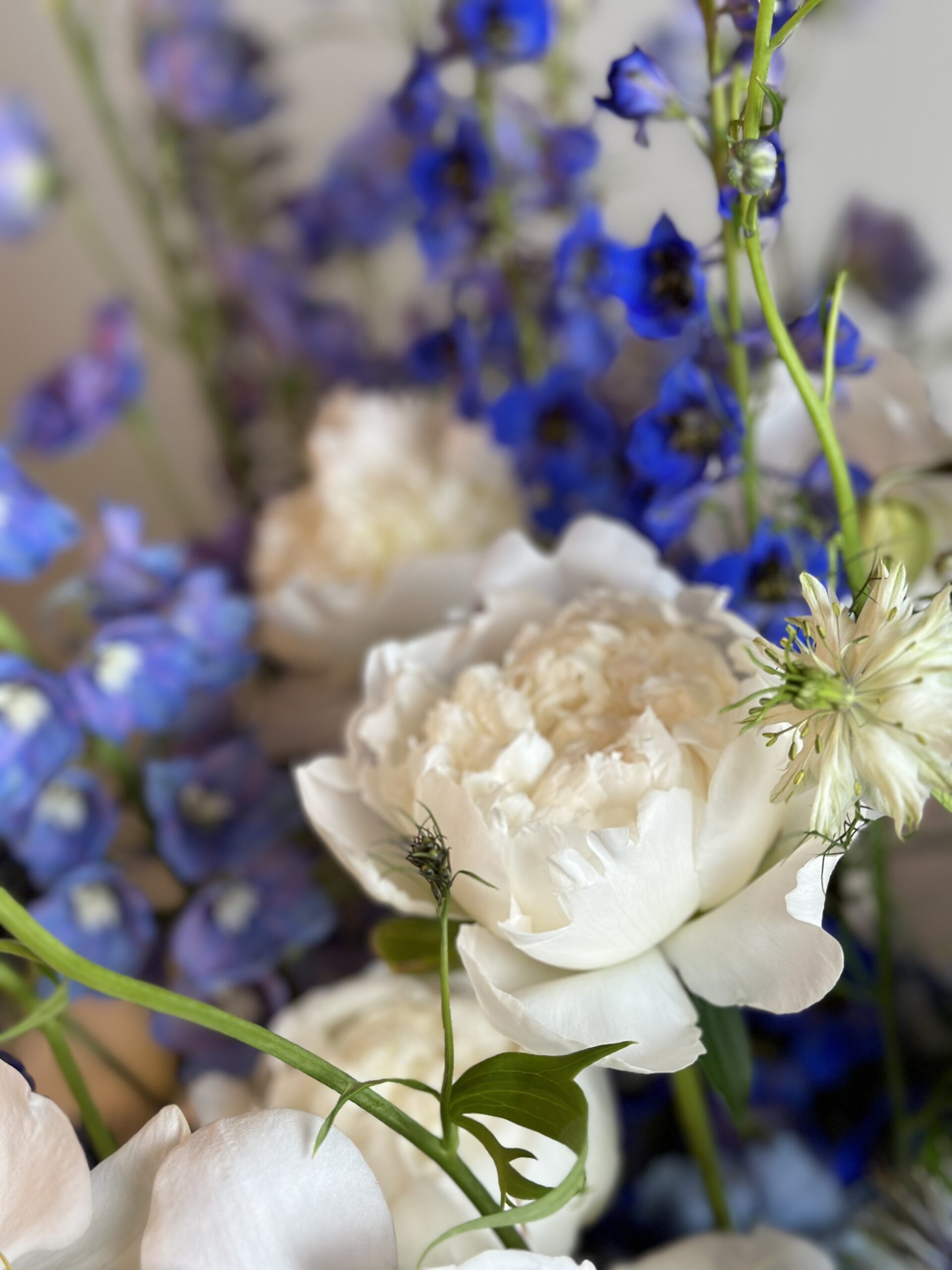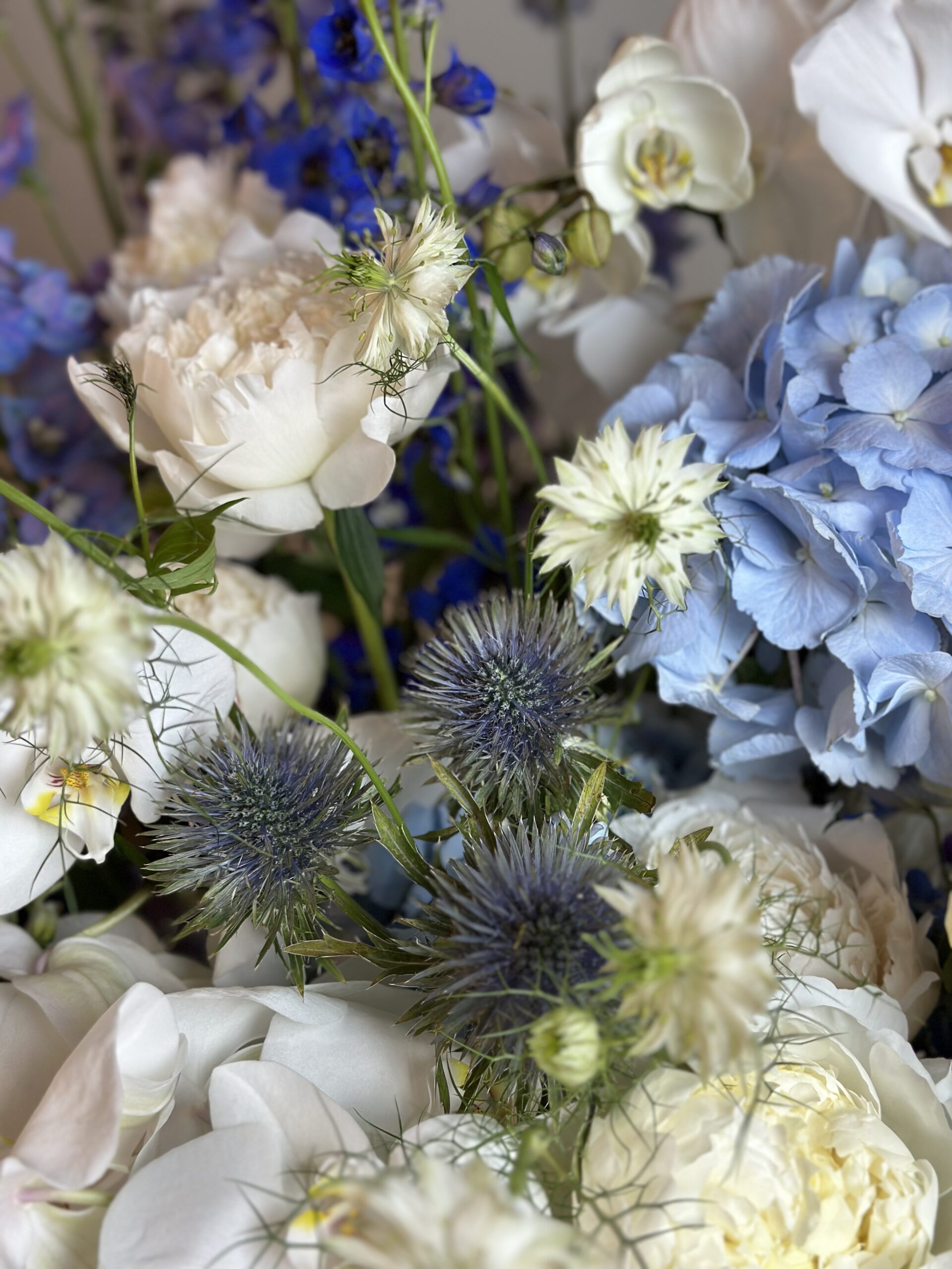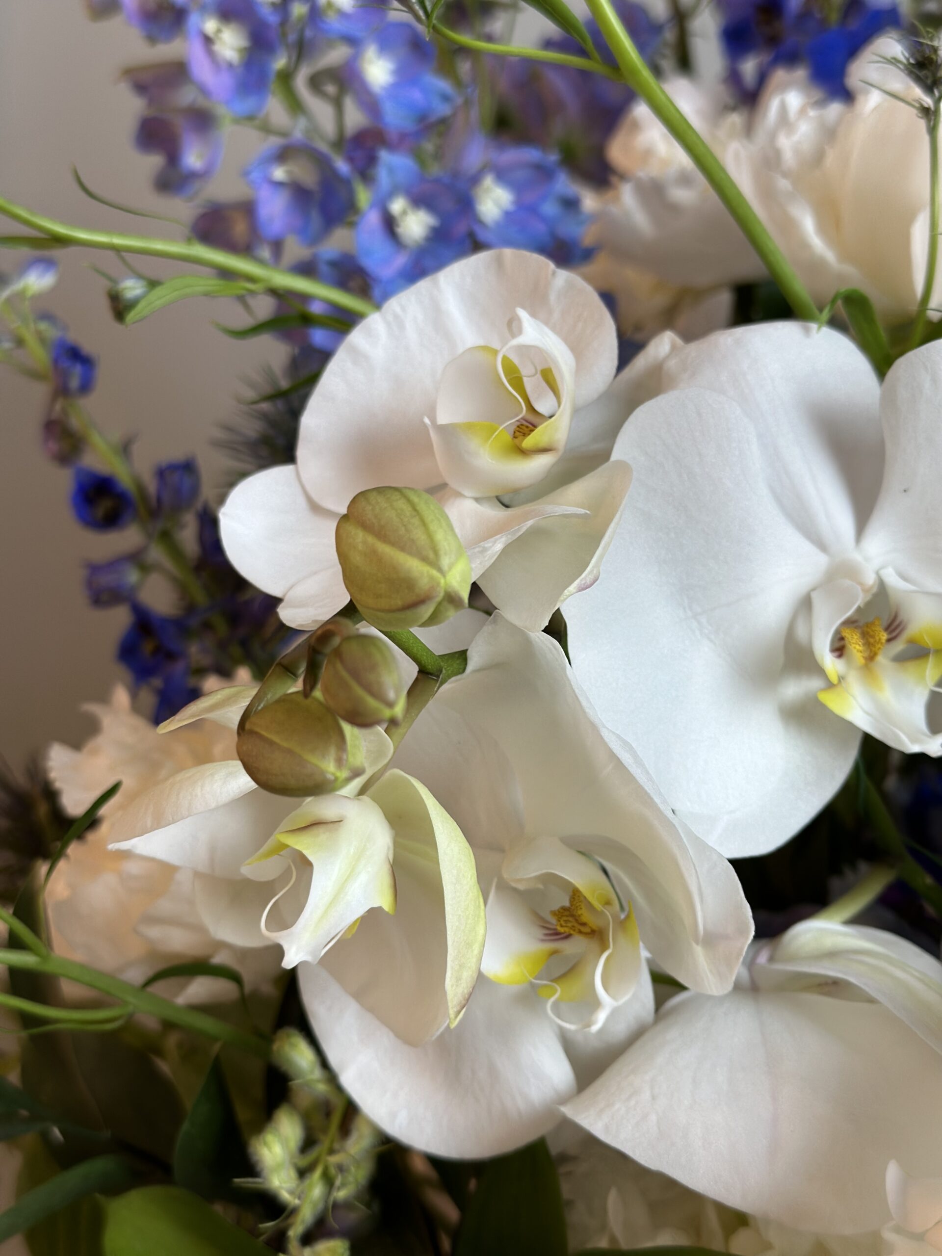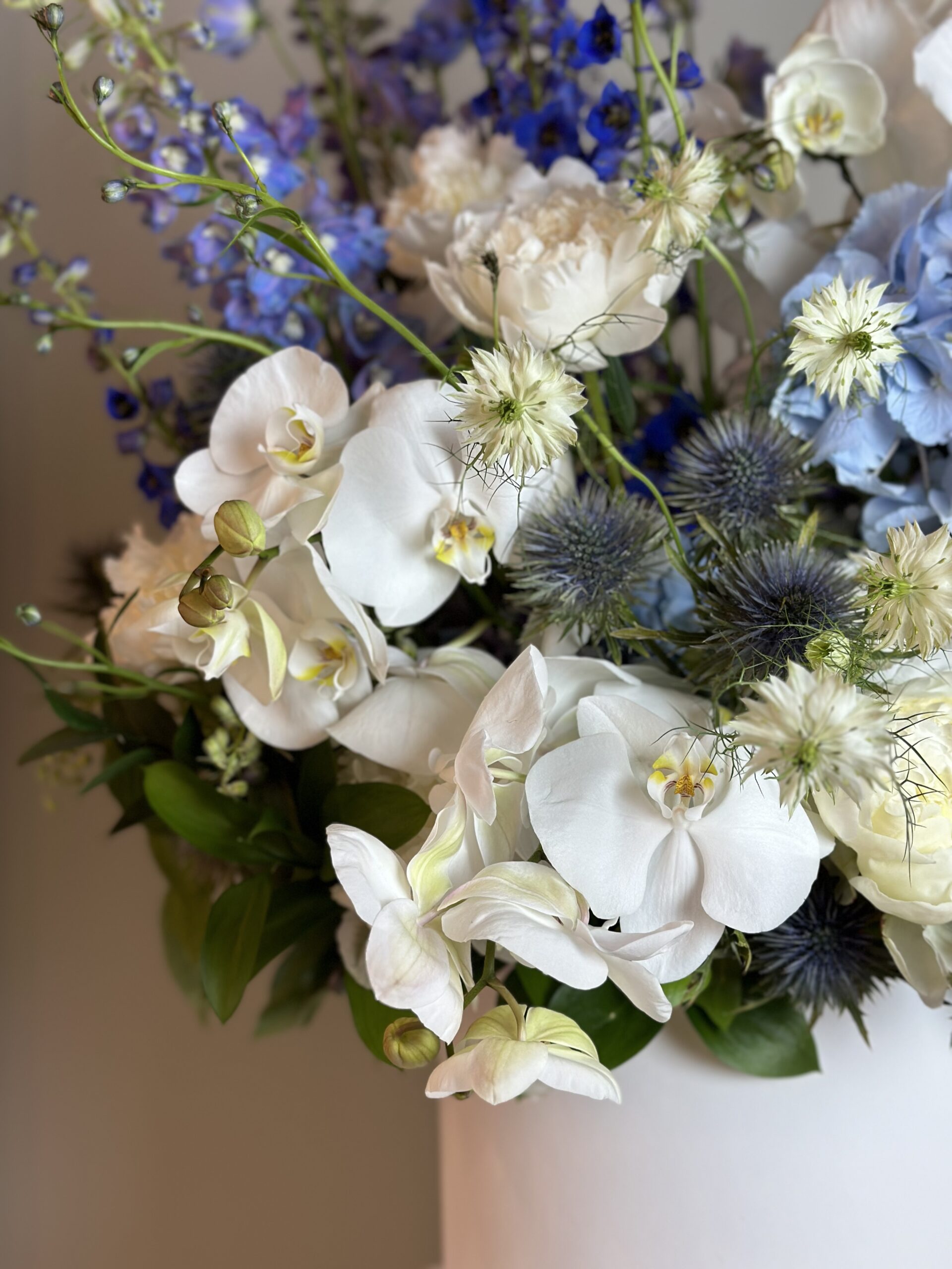 Нежная летняя композиция в коробке в бело-голубой цветовой гамме. В составе: пион, орхидея, гортензия, дельфиниум и эрингиум.