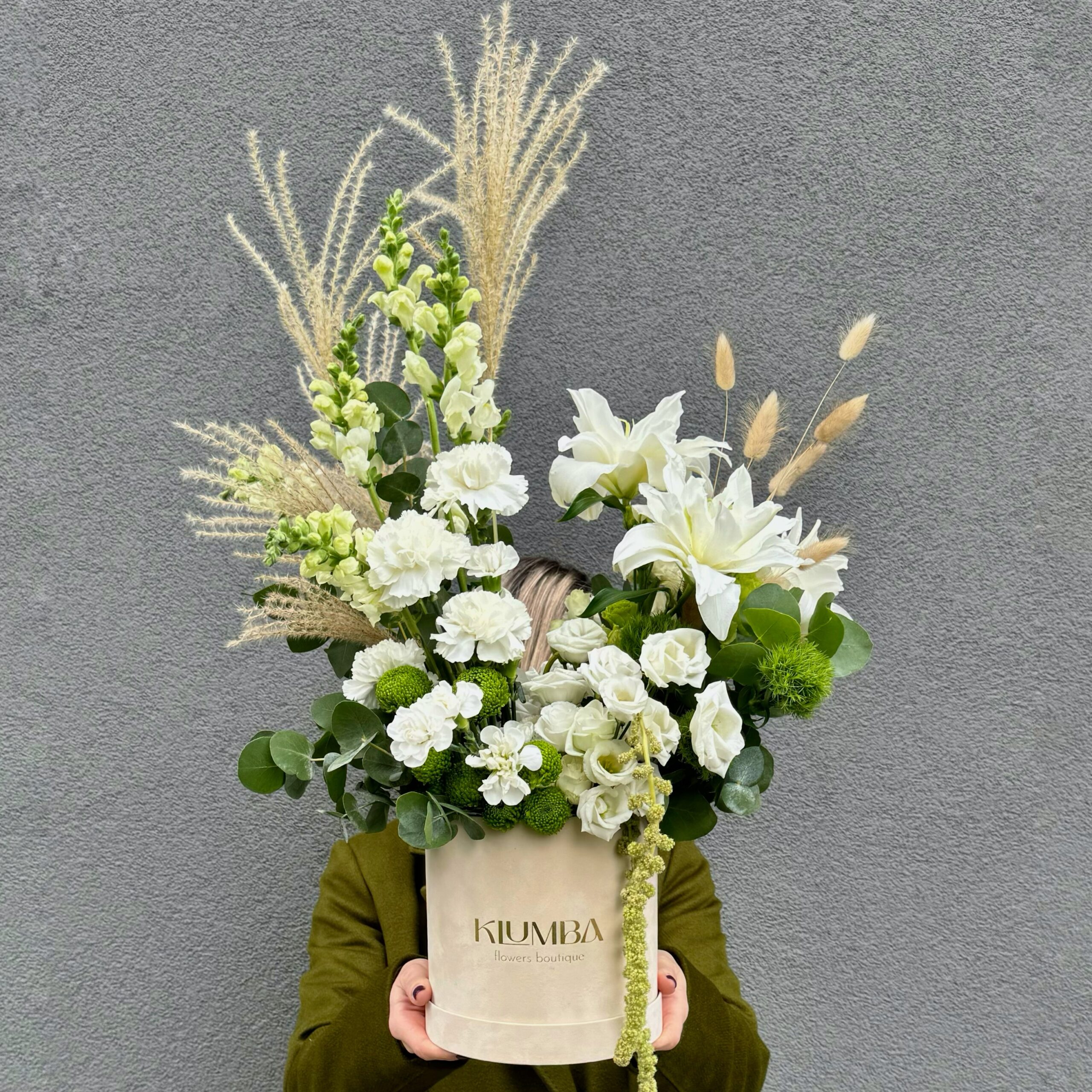 Нежная композиция в коробке в белой цветовой гамме. В составе: лилия, маттиола, диантус, эустома и эвкалипт.