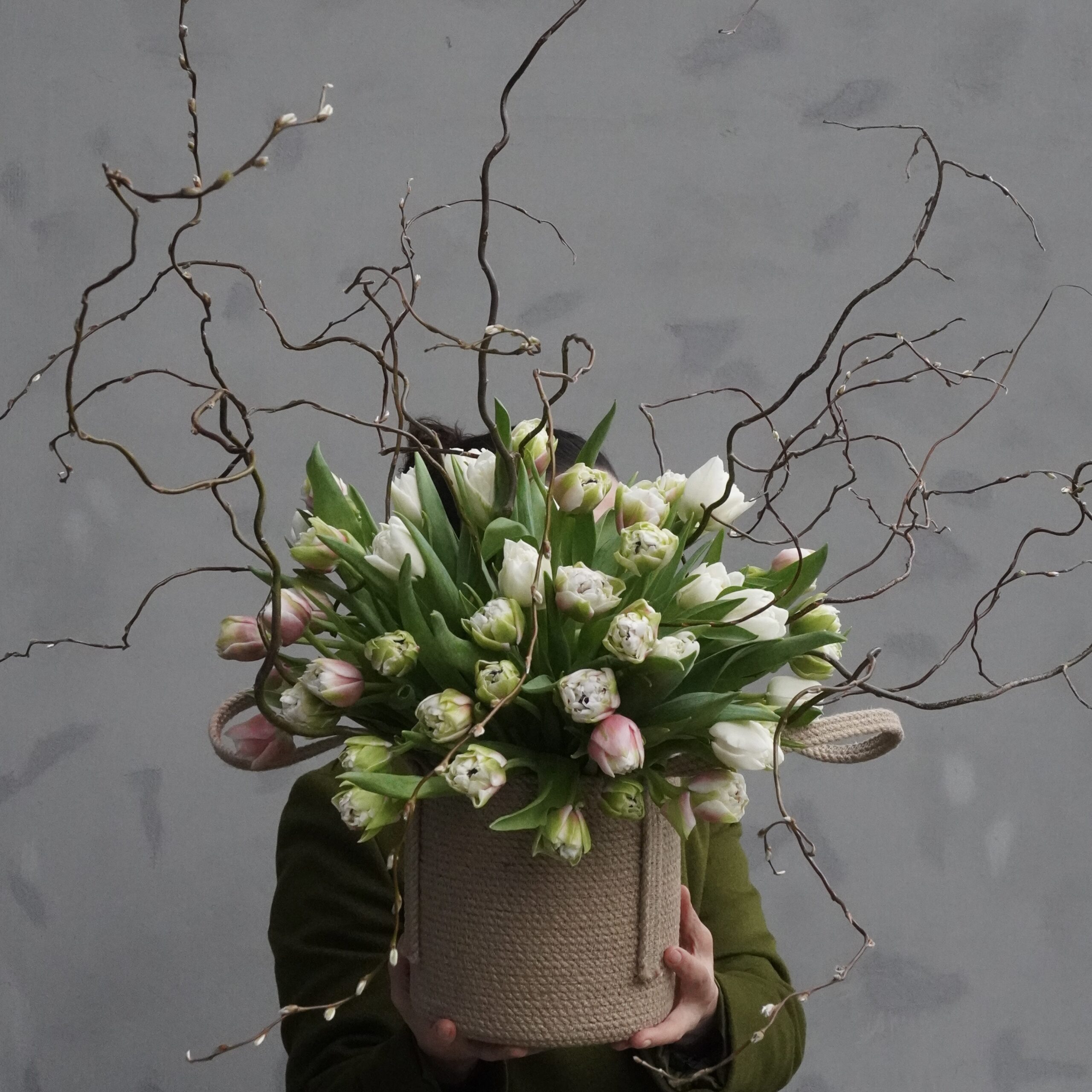 Нежная композиция в корзине в белой-розовой цветовой гамме. В составе: 75 пионовидный тюльпан и декоративные ветки.
