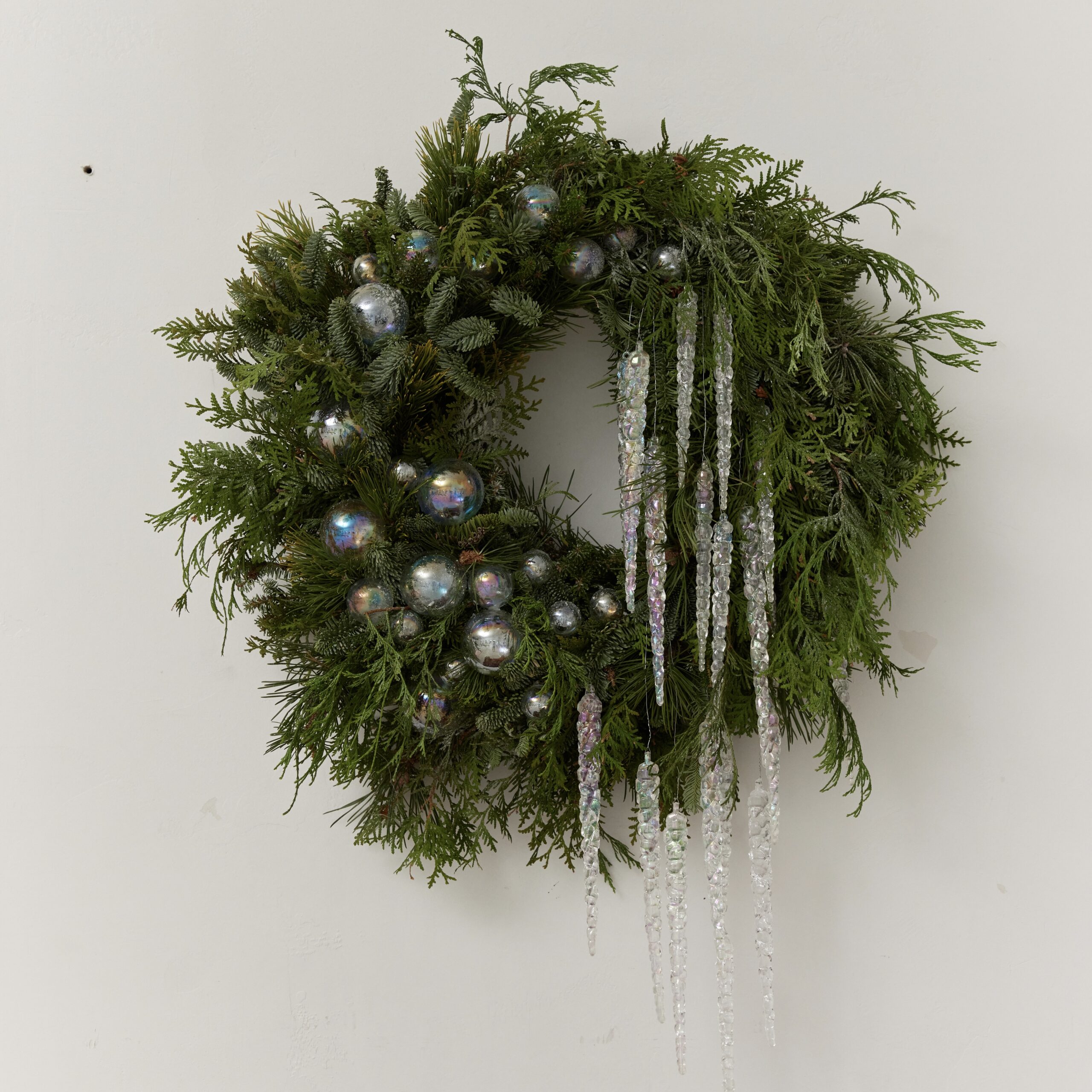 Новогодний венок, выполененный из веток датской ели Нобилис. Декорирован в серебряной цветовой гамме. Для украшения использованы: стеклянные шары, игрушки и декоративные ветки. При правильном уходе венок порадует 3-4 недели.