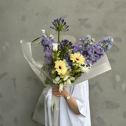 Летний букет в фиолетово-желтой цветовой гамме. В составе: гербера, дельфиниум, агапантус и колокольчик. Букет перевязан декоративными лентами и упакован в