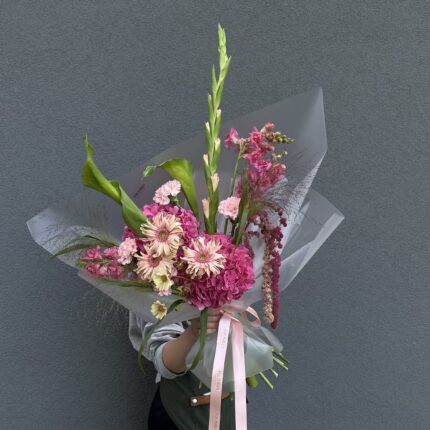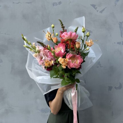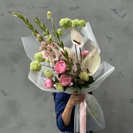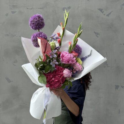 Летний букет в розовой-фиолетовой цветовой гамме. В составе: пионы, гортензия, антуриум, гладиолус, алиум и вибурнум. Букет перевязан декоративными лентами и
