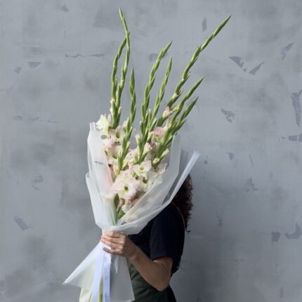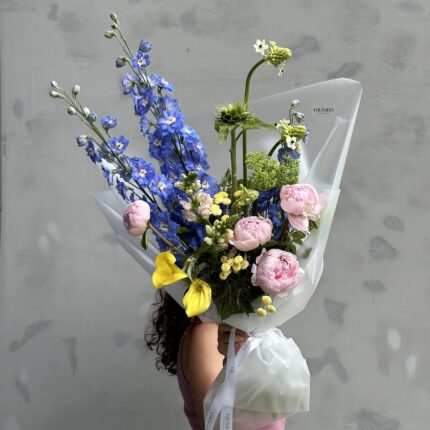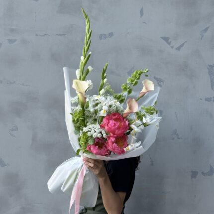 Нежный букет в розово-белой цветовой гамме. В составе: пионы, дельфиниум, гербера, орнитогалум и малюцелла. Букет перевязан декоративными лентами. С букетом