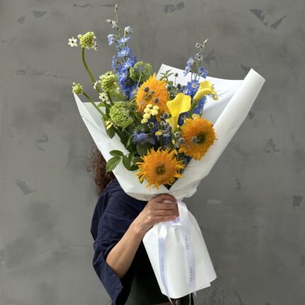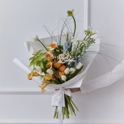 Яркий букет в оранжево-зеленой цветовой гамме. В составе: ранункулюс, кала, нарине, орнитогалум, дельфиниум, тюльпан, нарцисс, чойсия и берграс. Букет упакован