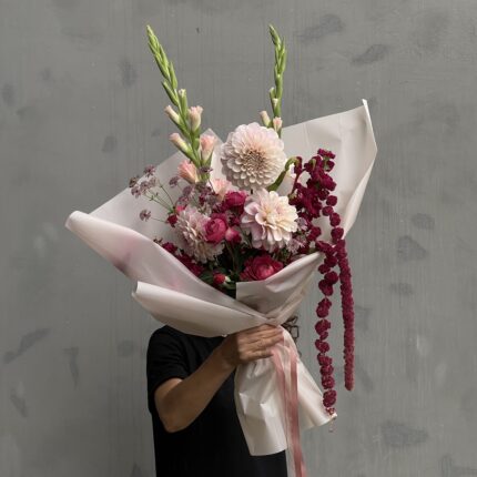 Летний букет в розовой цветовой гамме. В составе: георгин, гладиолус, кустовые розы и амарант. Букет перевязан декоративными лентами и упакован