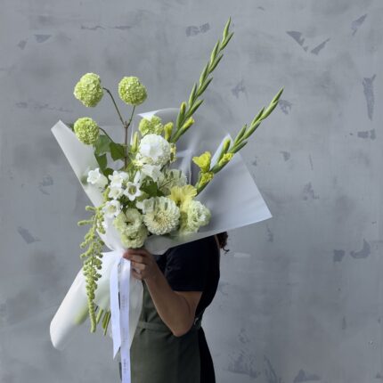 Нежный букет в белой цветовой гамме. В составе: георгин, гладиолус, эустома, амарант и вибурнум. Букет перевязан декоративными лентами и упакован