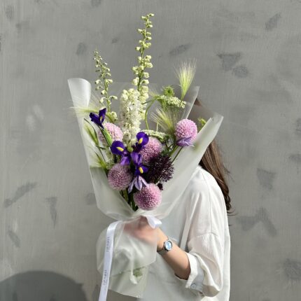 Яркий букет в фиолетовой цветовой гамме. В составе: георгин, дельфиниум, ирис и паникум. Букет перевязан декоративными лентами и упакован в