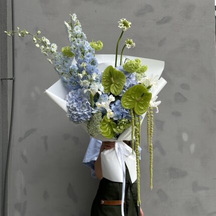 Летний букет в зелено-голубой цветовой гамме. В составе: антуриум, дельфиниум, ирис, орнитогалум и амарант. Букет перевязан декоративными лентами и упакован