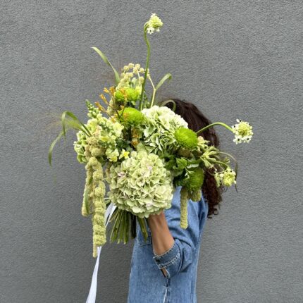 Летний букет в зеленой цветовой гамме. В составе: гортензия, орнитогалум, амарант и диантус. Букет перевязан декоративными лентами. С букетом вы