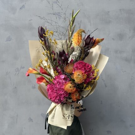 Букет в розово-оранжевой цветовой гамме. В составе: гортензия, калла, книпхофия, леукоспермум, гладиолус и вибурнум. Букет перевязан декоративными лентами и упакован