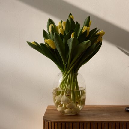 Уникальная композиция, которая подарит весну дважды! Яркие жёлтые тюльпаны представлены в необычном формате — прямо с луковицами, помещёнными в стильную