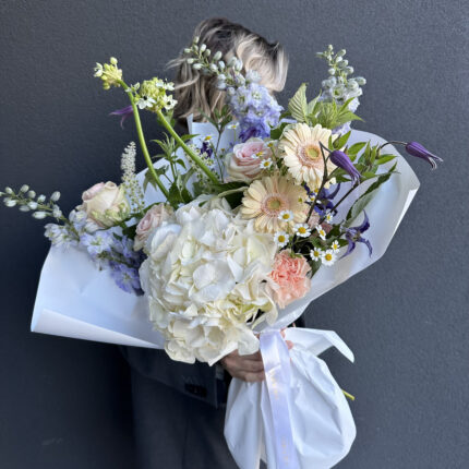 Нежный букет в персиково-голубой цветовой гамме. В составе: гортензия, герберы, дельфиниум, розы и клематис. Букет перевязан декоративными лентами и упакован