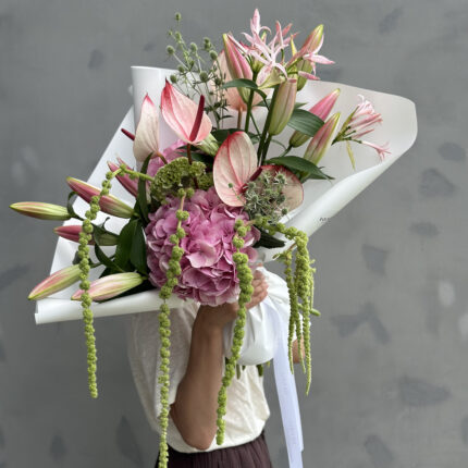 Стильный букет в нежно-розовой цветовой гамме. В составе: лилии, антуриум, гортензия, нарине и амарант. С композицией вы получите инструкцию по