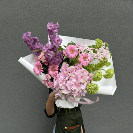 Стильный букет в нежно-розовой цветовой гамме. В составе: гортензия, дельфиниум, гербера и вибурнум. С композицией вы получите инструкцию по сохранению
